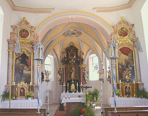 im Aufsatzbild des linken Seitenaltars die Wetterheiligen Johannes und